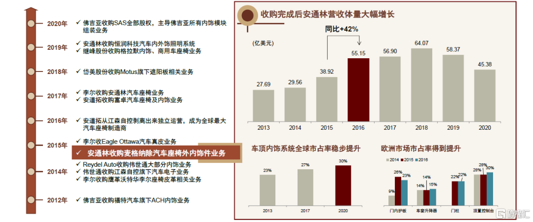 對標海外,行業巨頭整合帶來集中度大幅提升。由於內飾行業市場格局散亂、利潤率較低的特點,2012年開始國際零部件巨頭出於長期發展考慮,逐步剝離其內飾件業務,給予頭部內飾件供應廠商整合市場的契機,促成行業集中度的不斷提升。以安通林收購麥格納內飾件相關業務為例,整合完成後安通林整體收入規模實現大幅增長,內飾件市佔率得到進一步提升。