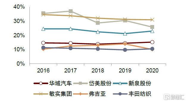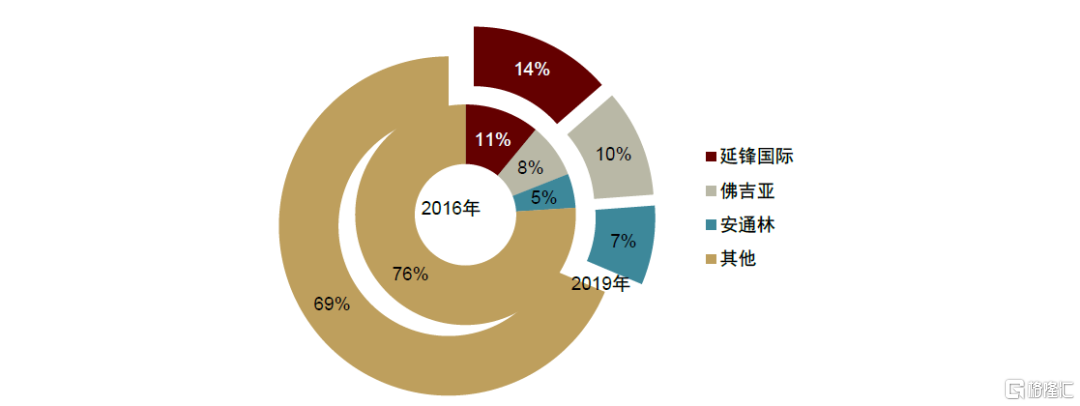 行業集中度較低,穩定的競爭格局尚未形成。全球內飾巨頭包括延鋒國際、弗吉亞、安通林、豐田紡織、李爾、麥格納等,2019年全球內飾件市場佔有率前三企業分別是延鋒國際、弗吉亞、安通林,CR3合計佔比為31%,相對2016年佔比24%提升7.4ppt。相較於下游行業穩定的競爭格局,頭部內飾件廠商雖參與主流車企全球配套,但因內飾件產品種類繁多,技術開發難度低,行業參與者眾多,使內飾件行業整體呈現高度分散,集中度低的行業格局。