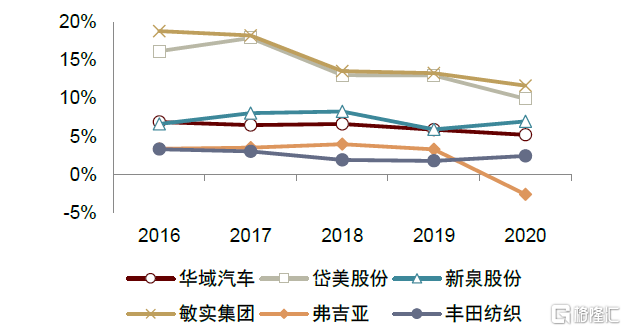 整合帶來毛利水平顯著提升,盈利能力未有顯著變化。安通林通過不斷收購整合內飾件業務,規模效應得以顯現,2020年毛利率達到35%,顯著優於行業其他競爭廠商。但從盈利能力角度看,安通林EBITDA率仍處於行業低位水平,盈利能力仍有較大提升空間。