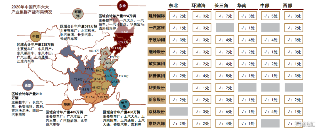 全國化產能佈局配套整車市場更具競爭優勢。隨着國內汽車產能擴張,全國汽車產業由原來長春、上海、武漢3大產業基地,演變成6大產業集羣,大致分佈長三角地區、環渤海地區、華南地區、東北地區、中部地區及西南地區,各區域年產能超200萬輛。國內頭部內飾件企業多選擇配套產能佈局,以實現及時響應客户需求,降低運輸成本。目前,延鋒國際、寧波華翔、繼峯股份、拓普集團、新泉股份已實現全產業集羣產能佈局,在響應速度與運輸成本方面具備相對優勢。