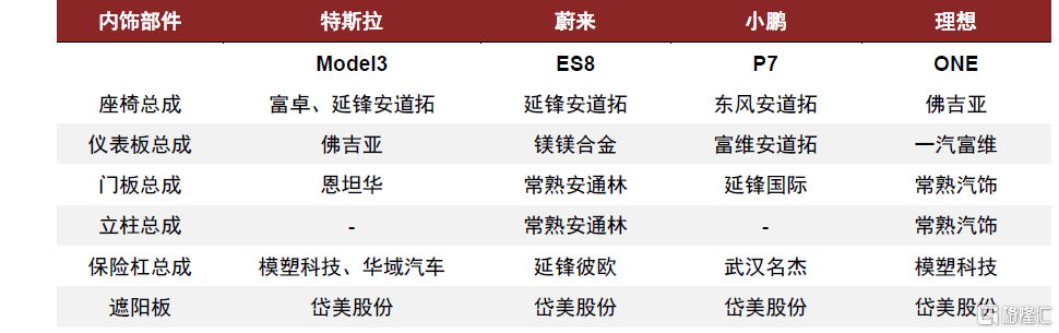 圖表19:造車新勢力主要內飾件供應商一覽