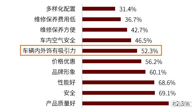 汽車內飾系統是打造直觀化差異體驗的重要來源,為消費者購車重要考慮因素。隨着汽車的普及,汽車正逐步成為家庭空間、工作空間外的第三空間,汽車內飾系統是打造此安全、舒適的“移動式第三空間”的硬件系統,同時以“插件形式”集成各種軟件服務功能。基於此,汽車內飾系統是創造消費者對汽車品質、品牌形象等直觀化差異體驗的重要來源,飾件的美觀性、舒適性和質感逐漸成為影響消費者購買決策的重要指標,因此汽車廠商通常高度重視汽車內飾的設計及配置,豪華的內飾設計成為高端汽車品牌的,也是國產品牌提升汽車質感和性價比的發力點之一。