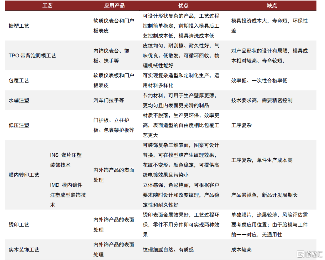 汽車內飾件加工工藝多元。汽車內飾件種類較多,涉及多種生產工藝。搪塑工藝、TPO帶背泡陰模工藝、注塑工藝等主要用於生產結構件及內飾件表面材料,膜內轉印工藝、燙印工藝、實木裝飾工藝主要用於生產裝飾性部件,不同工藝具備不同優缺點。以生產複雜度較高的儀表盤為例,搪塑工藝造型自由度高,所制產品有良好的彈性和低收縮率,現階段應用較為廣泛,並逐步從中高端車型下探到中低端車型中使用。我們認為,生產廠商通常綜合考慮產品定位、工藝複雜度、成本投入、技術稟賦等因素選擇生產工藝。整體看,內飾件的生產製造朝着精密化、環保化的方向發展。