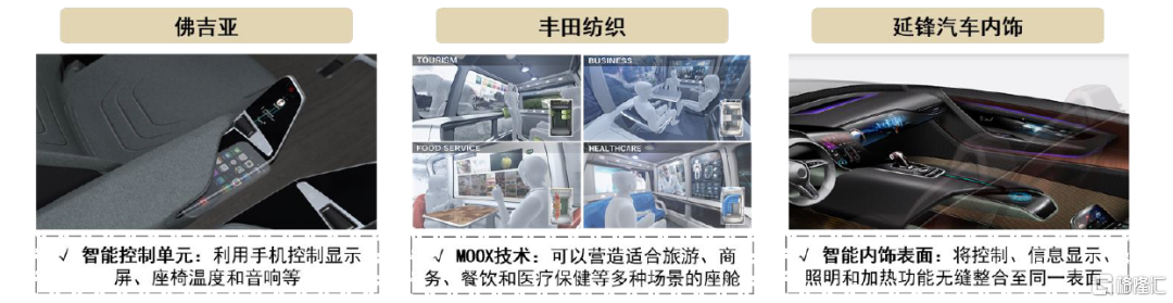 國際內飾件龍頭廠商如豐田紡織、延鋒等,紛紛佈局電子化、智能化內飾產品,使傳統的汽車內飾趨於個性化和多功能化。例如,佛吉亞開發的車載連接接口可以使智能手機集成到乘客最方便的車內位置,並可以使用手機控制顯示屏、座椅的温度或音頻等;豐田紡織針對自動駕駛汽車推出了可用於L5級自動駕駛的MOOX設計,可以滿足座艙內乘客的旅遊、商務、餐飲和醫療等各種需求;延鋒汽車內飾打造的智能內飾表面將車艙內的各種功能整合到同一個表面,只有在啟用時才會顯示,從而變成兼具功能性和美觀性的內飾表面。