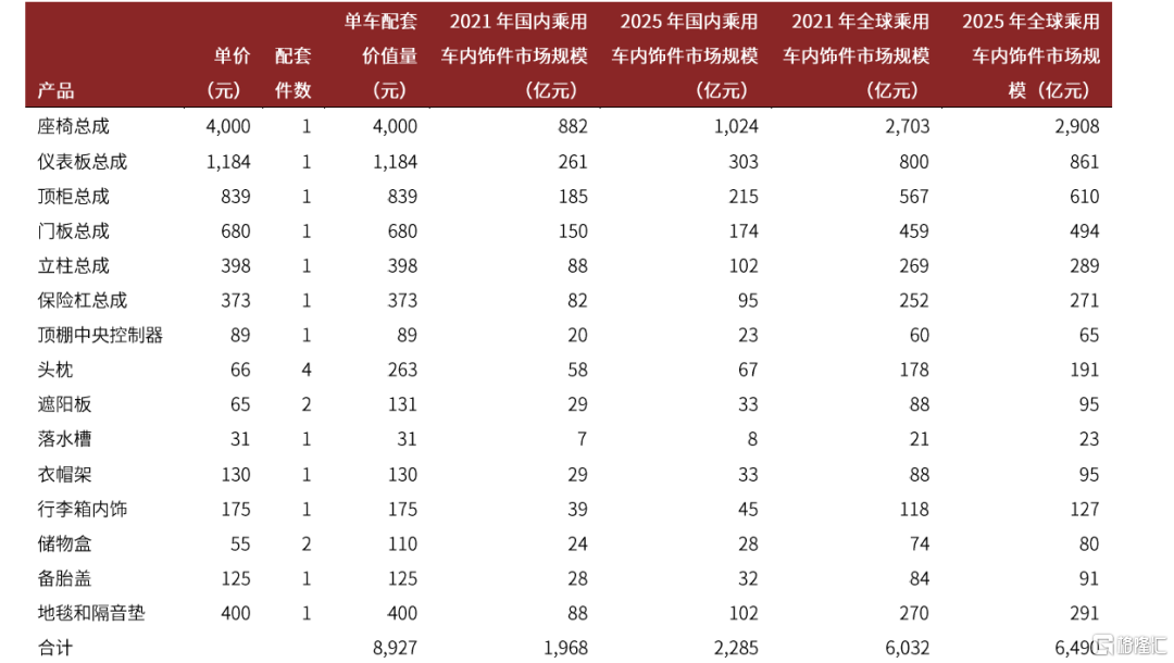 2021年國內汽車內飾件市場規模接近兩千億元。基於我們對全球與中國汽車產銷水平的測算,我們測算得出乘用車內飾件市場規模分別為:1)全球市場:2021/2025年全球乘用車內飾件市場規模為6,032/6,490億元。2)中國市場:2021/2025年國內乘用車的內飾件市場規模為1,968/2,285億元。