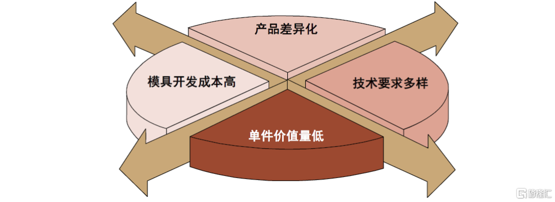 ►技術要求多樣:內飾件的生產流程中主要涉及了注塑、表面處理等各種工藝,不同產品所涉及的製造工藝差異巨大,通用性較弱。
