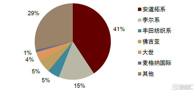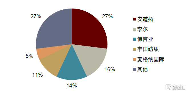 汽車座椅是行業集中度最高的細分子賽道。汽車座椅因其價值量大,單車成本佔比高,整車廠通常傾向於保持穩定的供應體系。同時,汽車座椅結構相對複雜,整車廠對第三方供應商的設計、組裝和供應鏈管理能力有較高的要求,行業進入壁壘高,2019年全球汽車座椅行業CR5佔有73%的市場份額。國內市場方面,安道拓系、李爾系、豐田紡織、佛吉亞、大世等外資或合資體系市佔率約為71%,競爭格局相對成熟穩定,優於內飾件行業整體。