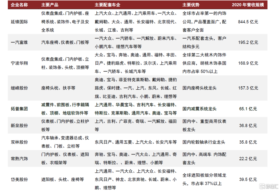圖表9:國內主流內飾企業、主要配套車企、主要產品