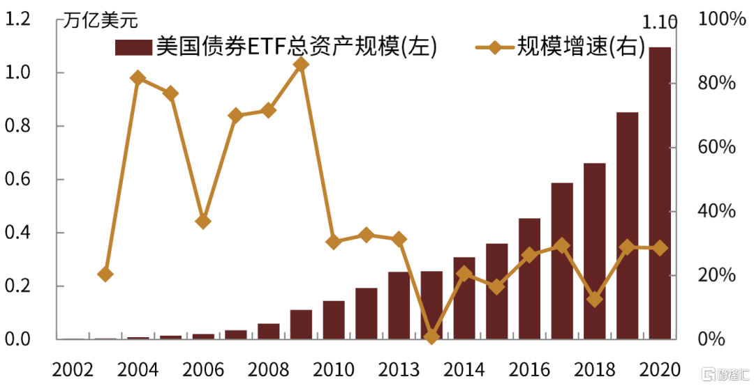 據Bloomberg統計,截至2020年末,美國債券ETF總規模近1.10萬億美元,是全球最大的債券ETF市場,並且近年來仍然維持相當高的規模增速,最近5年平均增速高達25%。