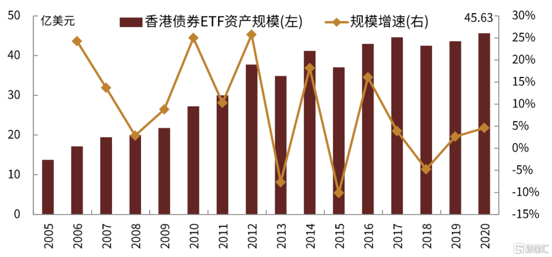 相比於其他市場,中國香港市場的債券ETF規模較小,截至2020年末,規模僅有不到46億美元,並且近年來規模增速均較低,且部分年份如2013、2015、2018年還出現了負增長。目前存續債券ETF僅有10只。同樣,中國香港債券ETF頭部化特徵也較為顯著,其中,沛富基金(2821.HK) 2020年末總資產規模近39.0億美元,為中國香港交易所規模最大的債券ETF,佔全市場規模比重高達85%。
