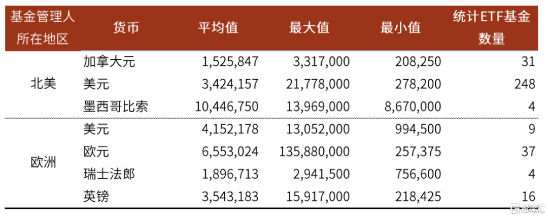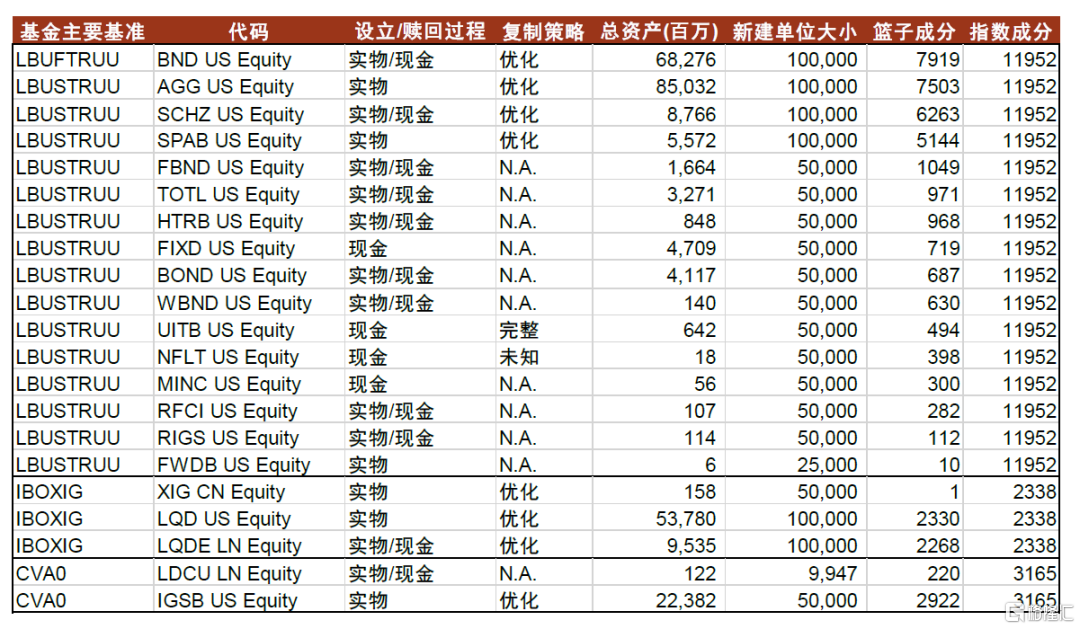 最小申購金額方面,每個市場可能有所差異。北美和歐洲市場平均最小申購金額在300-500萬美元左右,普遍要大於國內1000萬元人民幣的最小申購金額。最小申購單位(金額)需要確保新申購單位跟持倉籃子接近,使得新申購不會帶來籃子出現大的跟蹤誤差。ETF規模越小的基金,本身籃子成分券對指數的複製程度也越低,規模籃子成分券的數量也越少。這個時候,為了完全複製籃子成分,需要的申購金額也就越小。反之,如果規模較大的ETF基金,比如BND和AGG,本身規模就是全美最大,籃子持倉券也足夠多(都超過7000只,複製指數達70%),這個時候需要新申購一個交易單位需要的申購單位就比較大,需要100000份。並且,這類非常大的ETF基金已經非常受市場認可,不需要擔心申購單位過大會使得購買門檻過高,而屏蔽掉一些客户的問題。