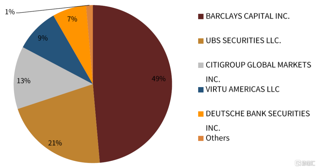 從美國市場來看,美國債券ETF做市商與基金管理人一樣,呈現頭部化的特點。我們從Bloomberg上選取市值前10的債券ETF在過去一年相關做市商交易的基金份額數量,可以發現:一、巴克萊佔據主要的交易量,其次是UBS和Virtu兩家做市商;二、前五大做市商佔據了絕大多數交易量。可以看出債券ETF做市商的市場份額也呈現明顯的頭部化特徵。