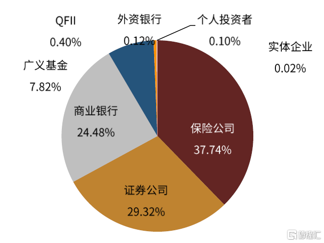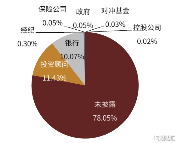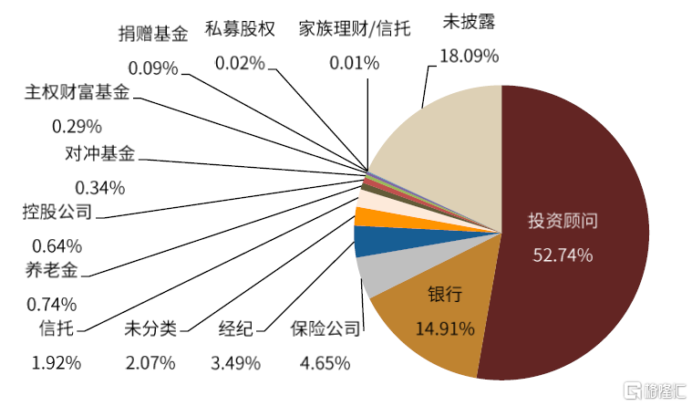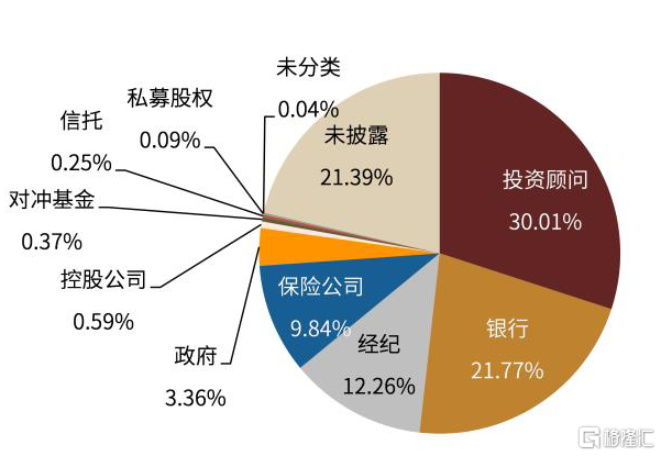 1.同美國市場類似,投資者多元化程度較高。持有債券ETF的投資者類型較多,包括投資顧問、銀行、養老金、經紀商、保險公司、私募股權、對沖基金、政府、控股公司等,投資者多元化程度也同樣較高。