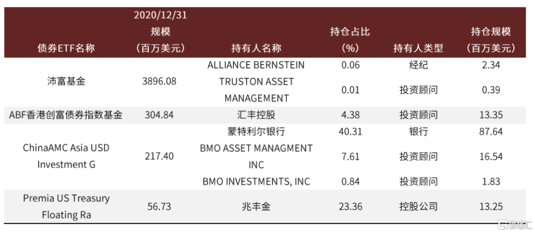 5.境外主權財富類機構也是典型的債券ETF的投資者。境外機構往往對本土市場的瞭解較少,缺乏債券市場OTC的交易途徑,並且無論是搭建本土團隊還是委外投資成本都較高,對於本土市場的投資需求更偏向於自上而下的分散化配置需求,具備債券ETF典型的客户畫像。在美國top5的債券ETF中,加拿大主權財富基金ALBERTA INVESTMENT MGMT CORP出現較多,正是體現了這一點。
