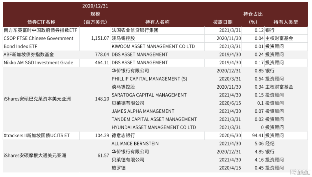 新加坡市場也處於發展初期,2020年才開始有所發力。從披露的信息來看,新加坡的債券ETF持有人類型主要包括投資顧問、主權財富基金、銀行和經紀商,其中新加坡的主權財富基金淡馬錫控股出現在最大的債券ETF南方東英中國政府債券指數ETF和ishares安碩巴克萊資本美元亞洲ETF中。新加坡的ETF發展離不開政府的大力支持,除了交易所制度等方面給與支持以外,政府還會在產品設計以及種子投資人方面給與大力支持,例如以主權財富基金出資等,政府的支持使得得到支持的新加坡的債券ETF基金得以具備一定規模。例如南方東英2020年末規模超過11.5億美元,在成立初始就具備一定規模,這樣就可以使得其他要求投資佔比不超過10%的投資者能夠配置。因此,南方東英債券ETF基金也吸引了許多海外投資者通過各種渠道前來認購。