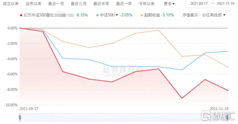 比如説像幻方量化旗下的這隻500指增產品,最近兩個月的跌幅比上次盤點時少了零點幾個百分點,現在是8.15%,不過依舊還是跑輸了中證500指數。