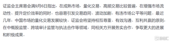 9月6日,易會滿表示:“量化交易、高頻交易在增強市場流動性、提升定價效率的同時,也容易引發交易趨同、波動加劇、有違市場公平等問題”。