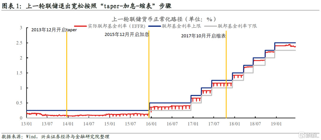 2013-2018年,美聯儲從退出寬鬆到收緊貨幣是新形勢下對新框架和新工具進行的試驗,整體取得了良好效果,上一輪的經驗很可能被本輪緊縮週期複製,“taper-加息-縮表”的順序大概率將被沿用。