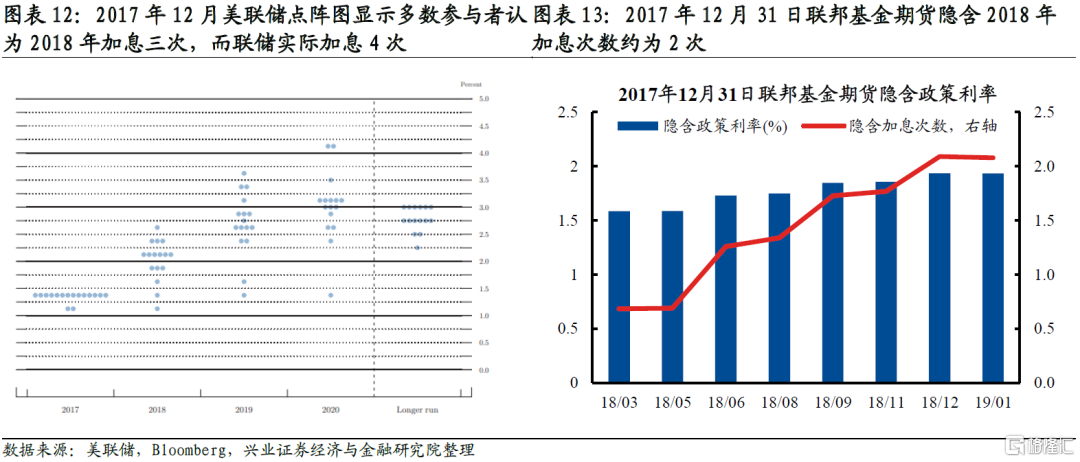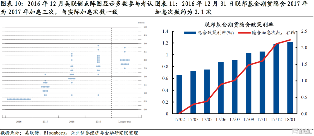大類資產走勢不由聯儲貨幣政策路徑決定,而是由預期差驅動。預期差驅動大類資產的邏輯在上一輪聯儲退出寬鬆的過程中得到完美演繹。2016年12月聯儲第二次加息並開啓加息週期,當月的點陣圖顯示2017年將加息三次。2016年12月31日聯邦基金期貨隱含利率顯示市場預期2017年將加息兩次,低於聯儲點陣圖的預測。2017年聯儲實際加息三次,與2016年12月點陣圖的預測一致。對應到大類資產上,2017年大部分時間10年美債利率震盪下行,美元指數更是大幅下行,這與基本面和通脹讀數上行的宏觀背景相違背。事後看,儘管2017年聯儲加息次數超出聯邦基金期貨市場的預期,但符合聯儲自己的指引,因此實際加息對資產價格的影響並不顯著。再看2018年,2017年12月點陣圖顯示2018年將加息三次,聯邦基金期貨顯示只加息兩次,而2018年聯儲實際加息四次,收緊幅度超出市場預期。因此儘管2018年美國基本面已出現見頂跡象,但十年美債收益率仍然上行且美元指數走強。