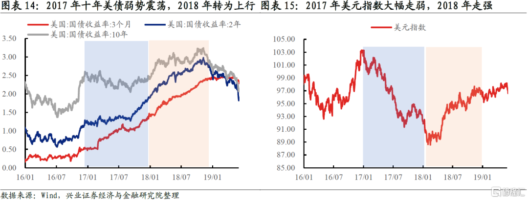 大類資產走勢不由聯儲貨幣政策路徑決定,而是由預期差驅動。預期差驅動大類資產的邏輯在上一輪聯儲退出寬鬆的過程中得到完美演繹:2017年聯儲加息沒有超出市場預期,因此十年美債收益率和美元指數下行;而2018年聯儲加息幅度超出市場預期,因此十年美債收益率和美元指數上行。