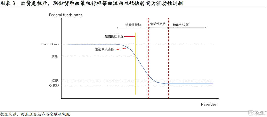 “先加息,後縮表”代表聯儲貨幣政策執行框架由流動性短缺轉變爲流動性過剩。我們曾在專題報告《IOER和ONRRP對聯儲退出寬鬆意味着什麼?》中詳細闡述了次貸危機後,美聯儲貨幣政策執行框架由“流動性短缺”轉變爲“流動性過剩”,貨幣政策實施工具由“走廊系統”轉變爲“地板系統”。“先加息,後縮表”的政策路徑是貨幣政策執行框架轉變的結果。次貸危機前,美國超儲規模維持在較低水平,聯邦基金利率對超儲規模變化十分敏感,超儲需求曲線爲一條陡峭的曲線。美聯儲通過公開市場操作可以有效將聯邦基金實際利率控制在聯邦基金目標區間內。次貸危機後,美國超儲規模大幅上升,聯邦基金利率對超儲變化不再敏感,超儲需求曲線變得十分平坦,美聯儲無法再依靠公開市場操作來調節聯邦基金利率,轉而藉助IOER和ONRRP組成的“地板系統”來調節聯邦基金利率。如果是先縮表,後加息,代表聯儲的意圖是先抽離銀行體系剩餘流動性,向次貸危機前的“流動性短缺”框架靠攏。“先加息,後縮表”則意味着聯儲採用“流動性過剩”框架,加息不受資產負債表規模和超儲規模的影響。實踐證明,在“流動性過剩”框架下聯儲順利實現了貨幣政策正常化。並且在縮表階段,聯儲發現,受市場結構和監管因素影響,超儲需求不再像次貸危機前那樣容易預測,這意味着“流動性短缺”框架的實施難度顯著增大。因此未來很長一段時期內,“流動性過剩”很可能都將是聯儲的貨幣政策執行框架。