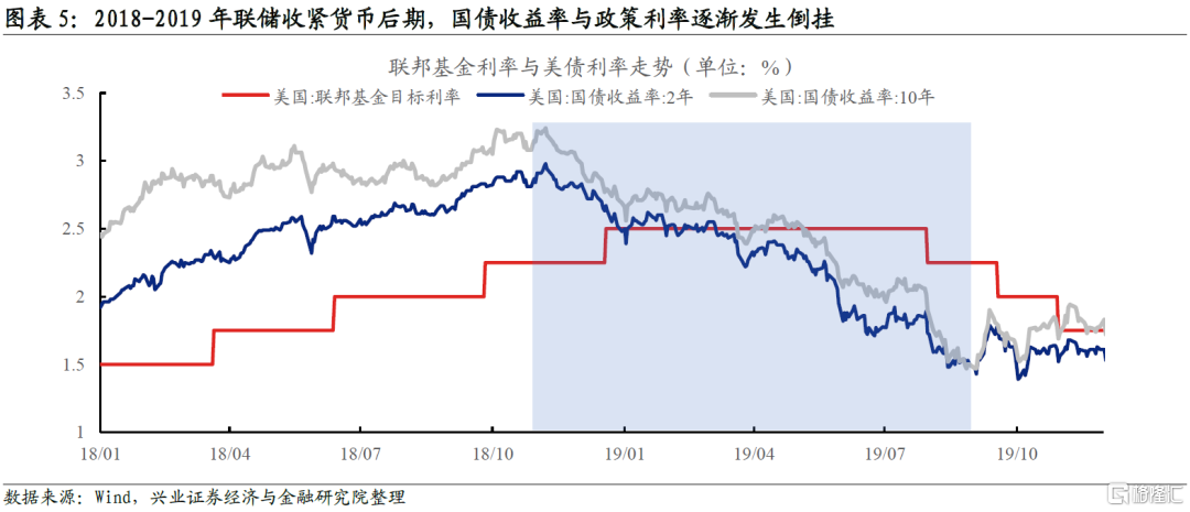 “先加息,後縮表”提高了貨幣政策靈活性並增強了聯儲應對負面衝擊的能力。在聯儲啓動貨幣政策正常化時,美國經濟復甦並不鞏固,如果是先縮表,在基本面出現負面衝擊時,聯儲不得不逆轉收緊政策,在利率仍在零利率地板時進一步滑向擴表的“深淵”。如果選擇先加息,同時保持資產負債表的規模不變,一定程度可以起到對衝貨幣收緊的效果,未來經濟形勢如發生變化,用利率工具應對起來更靈活,聯儲的經驗也更足。更進一步,加息是直接調控短端利率,縮表對長端利率的影響更大(QE壓縮期限利差,縮表則相反),加息和縮表的順序安排也可能實現對收益率曲線的微調。一般而言,聯儲加息的過程中美債收益率曲線走向熊平,如果先加息,後縮表,在加息後半段就能提高期限利差,防止或推遲曲線倒掛的情況出現。在加息後期,美債的問題不是需求不足,而是基本面預期轉弱導致美債需求上升,2018-2019年短端和長端利率均大幅下行並與聯邦基金利率倒掛。在這個階段縮表就能一定程度緩和美債供求的矛盾。