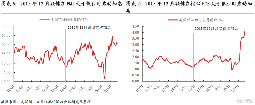 這次聯儲收緊貨幣的宏觀背景與上一輪收緊週期完全不同。2015年聯儲啓動加息時,美國基本面復甦基礎仍不鞏固,核心通脹離2%的目標值還有很遠的距離,聯儲執行的是一套“事前預防”的貨幣政策框架,可以說是爲了實現貨幣政策正常化而加息。2016年底經濟形勢進一步明朗,通脹從底部擡升後,聯儲才真正開啓一段長達兩年的加息週期。而在2022年,聯儲很可能因爲通脹而被動加息,這將是一系列“事後補救”的貨幣政策措施。2013-2018年,美聯儲從退出寬鬆到收緊貨幣是新形勢下對新框架和新工具進行的試驗,整體取得了良好效果,上一輪的經驗很可能被本輪緊縮週期複製,“taper-加息-縮表”的順序大概率將被沿用。