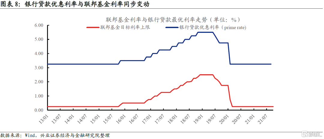 聯儲貨幣政策向實體的傳導主要是通過利率體系,加息是遏制通脹最有效的工具。目前聯儲仍然將通脹“甩鍋”給疫情和供給側,並且“用嘴”打壓通脹預期,但是通脹的高度和持續性越來越接近聯儲的忍耐閾值,聯儲將不得不通過收緊貨幣來打壓需求側以遏制通脹。在加息和縮表中,加息是應對通脹更有效的工具。因爲債券市場利率(主要是短端)和信貸市場利率(Bank Prime Loan Rate)與聯邦基金利率直接掛鉤,聯邦基金利率擡升可以直接傳導至居民房貸、車貸、信用卡貸款成本以及企業信貸成本。縮表對全社會融資成本的傳導並不直接,儘管縮表對長端利率的影響更顯著,但這個影響很難準確量化,聯儲也很難通過政策精準調控。我國貨幣政策傳導也一定程度借鑑了美聯儲的模式,即通過OMO和MLF利率向LPR傳導進而影響實體的融資成本。