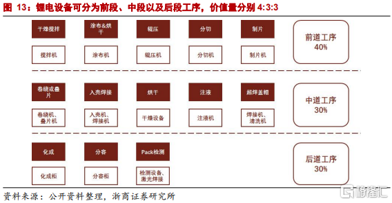 根據鋰電池製造工序的劃分,鋰電設備可分為前段、中段以及後段工序,三者的價值量佔比分別為40%、30%、30%左右。