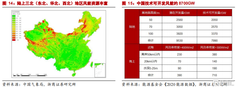 根據能源基金會《2020 能源數據》數據,中國陸上風能潛在開發量合計 9530GW, 技術可開發量 7990GW;海上風能潛在開發量(風功率密度>300w/平米)約 710GW。隨着技術進步,風電潛在可開發資源仍將繼續增加。截至 2020 年底中國累計風電裝機量約 282GW,其中陸上風電裝機量約 271GW、 海上風電裝機量約 9GW。中國陸上風電技術可髮量是目前累計裝機量的 30 倍,海上 風電技術可開發量是目前累計裝機量的 80 倍。