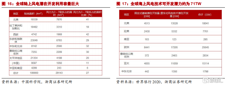 全球陸風資源超100萬GW,海風目前僅開發0.05%。根據前國家電網董事長劉振亞《全球能源互聯網》一書的數據,全球陸地風能資源超過1萬億千瓦(1000TW,約合100萬GW);根據世界銀行2020年數據,全球海上風電技術可開發潛力約71TW(約合7.1萬GW)。