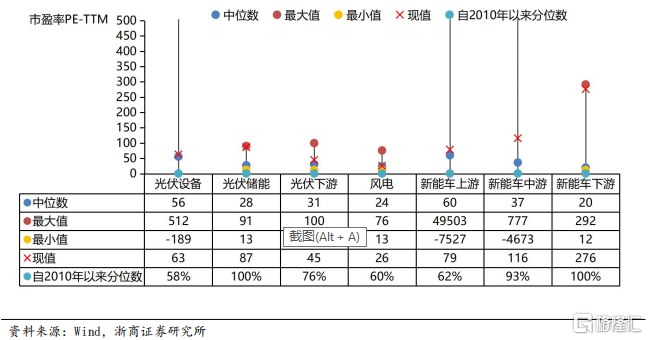 隨着新能源主要賽道的景氣大幅上升,相關板塊自2020年迎來實現了戴維斯雙擊行情。根據我們對新能源各賽道主要上市公司的估值測算,新能源下游、新能源中游和光伏儲能的估值最高,靜態市盈率分別為276、116和87倍,2010年以來的分位數分別為100%、100%和93%