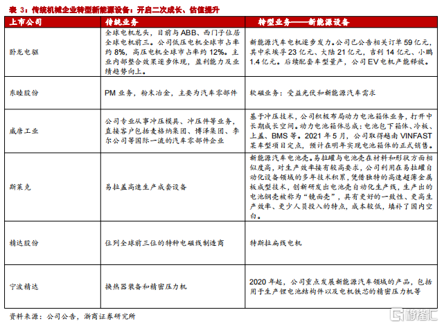 傳統企業加快向新能源設備轉型,為新能源產業做配套,從而開啟二次成長曲線,帶來估值提升。自下而上精選個股:推薦東睦股份、威唐工業,看好卧龍電驅、精達股份、斯萊克、寧波精達等。