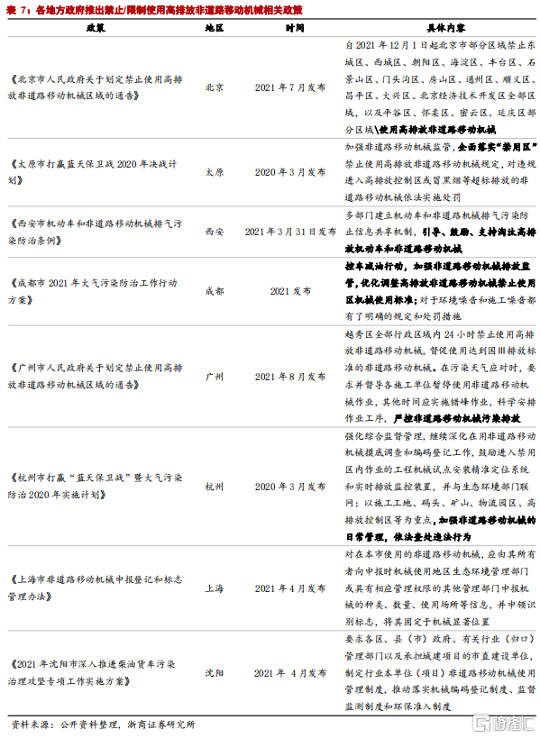 工程機械電動化:環保性、經濟性凸現;形成新增長點,提升全球市佔率。柴油車和非道路移動機械是大中城市氮氧化物污染的重要來源。在“雙碳”目標的背景下,中央和各地方政府出台政策鼓勵、支持和引導發展新能源非道路異動機械。鄭州市要求自2021年8月起,新增混凝土運輸車全部為純電動車。