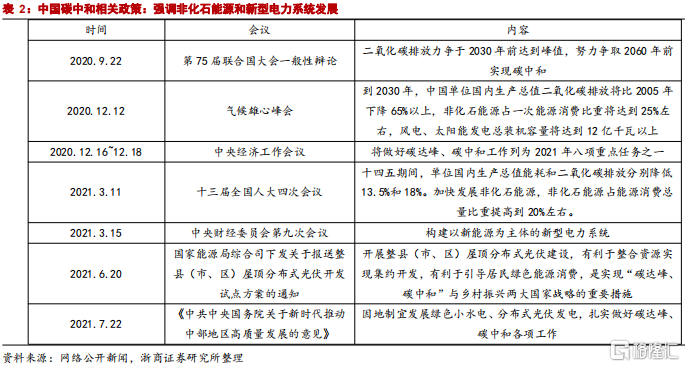 中國2030年“碳達峯”,2060年“碳中和”。中國政府一直高度重視全球氣候變化問題,積極承擔大國責任,出台措施大力發展清潔能源。2020年下半年以來,中國多次在各類會議上提及“碳達峯”“碳中和”等概念,顯示了中國政府節能減排,實現碳中和的決心
