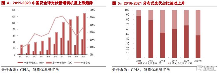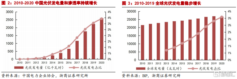 度電成本不斷下降、綜合優勢明顯,加之全球能源政策利好,光伏發電量和滲透率在過去十年間增長迅猛,新增裝機量年年攀升。從總量來看,全球光伏發電量佔發電總量的比例從2013年的1%上升到2019年的3%,新增光伏裝機2010年至2020年10年間增長超過3倍;中國光伏發電量在2010-2020年更是實現了從無到有再到世界領先的飛躍,新增光伏裝機2010年至2020年10年間增長將近20倍。