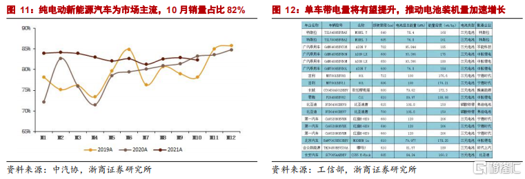 純電動車型為主流,表明消費者對新能源汽車的認可度越來越高。2018年以來,純電動車型的銷量佔比穩中有升,2020年平均約80%(下半年83%左右),2021年純電動汽車的銷量佔比更加穩定,10月佔比為82%。