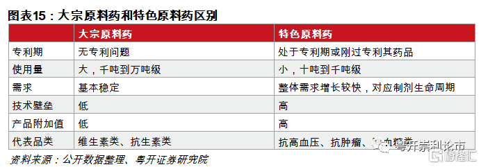 原料藥板塊包括大宗原料藥和特色原料藥。原料藥是指由化學合成、植物提取或者生物技術所製備的用於製藥的粉末、結晶、浸膏等。原料藥無法被患者直接服用,須加工成爲製劑,方能成爲可供臨牀應用的藥品。原料藥可分爲大宗原料藥和特色原料藥,大宗原料藥是指市場需求相對穩定、應用較爲普遍、規模較大的原料藥,主要包括抗生素類、維生素類和氨基酸類等。特色原料藥是指處於專利保護期或剛過專利保護期藥品的原料藥。