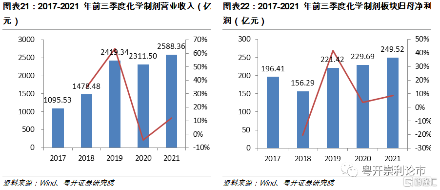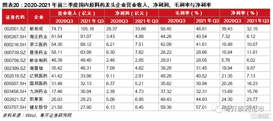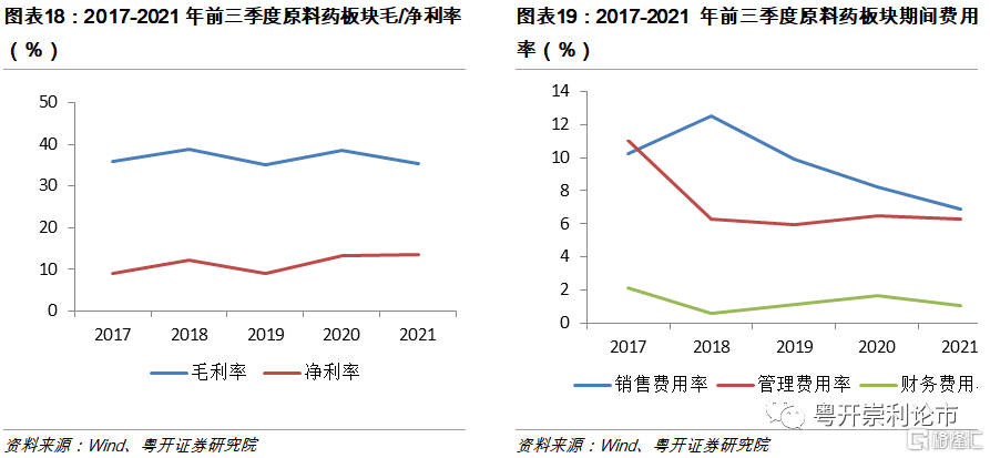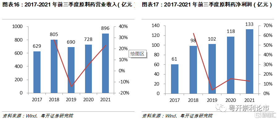 受益製造升級以及全球產業鏈的轉移,2021年我國特色原料藥板塊放量迅速。截至2021年三季度,原料藥板塊(34家企業)實現營業收入896億元,同比增長23.06%;實現歸母淨利潤133億元,同比增長12.88%。自2016年起,受環保趨嚴、產能過剩、大宗原料藥價格持續走低等影響,原料藥行業利潤空間進一步收窄,原料藥生產企業洗牌加劇,行業內低端產能逐步出清。隨着行業加速騰籠換鳥,我國原料藥行業正由中低端向中高端轉變,行業景氣度有望提升。