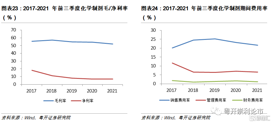 2021年化學制劑板塊盈利能力回調。2021年前三季度,化學制劑板塊毛利率爲52.19%,同比下降3.81%;淨利率爲6.96%,同比下滑0.07%。期間費用率爲29.48%,同比下降7.27%;其中銷售費用率爲21.63%,同比下降6.9%;管理費用率爲6.64%,同比下降4.98%;財務費用率爲1.21%,同比下降22.66%。行業整體利潤率與2020年基本持平,期間費用率持續下降,銷售費用、管理費用和財務費用同比均有所下降,行業整體盈利小幅回調。