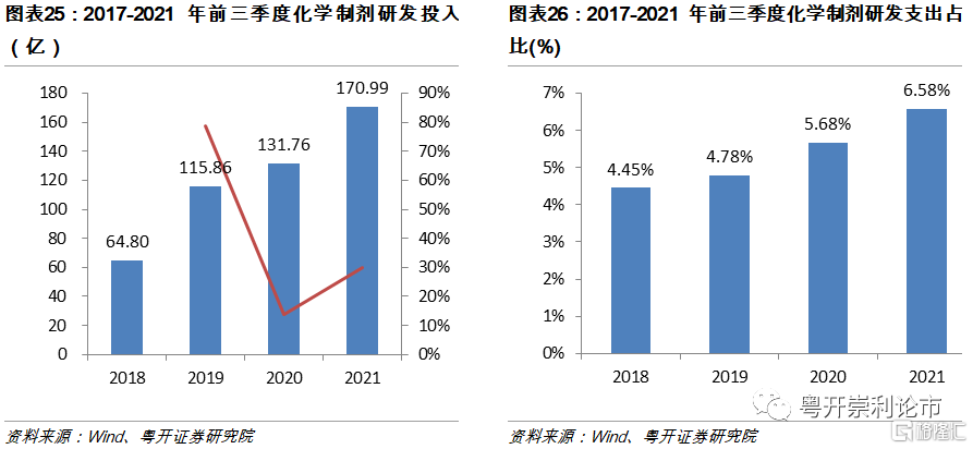 2021年化學制劑板塊研發投入快速攀升,研發投入佔比已超6%。2021年前三季度,化學制劑板塊研發投入達170.99億元,同比增長29.77%;研發支出總額佔營業收入比例達6.58%,同比增長0.9%。近年來,上市藥企高度重視創新研發,普遍加大研發投入力度,研發費用率及研發投入呈現攀升態勢。而在快速增長研發費用的背後,是製藥企業迅速豐富的核心領域產品管線,這是企業長期發展動能和實現彎道超車的關鍵所在。