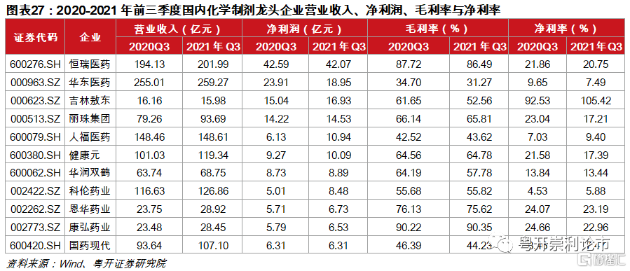 2021年前三季度,共6家化學制劑企業淨利潤突破10億元,其中恆瑞醫藥以42.07億元淨利潤高居首位。多家企業的盈利能力持續改善,由傳統仿製藥企業向仿創結合的改革已初見成效,包括健康元、科倫藥業、恩華藥業等。對此,我們重點推薦三條邏輯主線:(1)受宏觀政策如帶量採購衝擊較小的企業;(2)轉軌創新、研發投入不斷攀升的企業;(3)逆境反轉型企業,建議關注健康元、浙江醫藥、科倫藥業等。