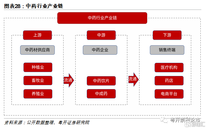 中藥行業產業鏈上遊是中藥材供應商,主要包括種植業、畜牧業和養殖業;產業鏈中遊是中藥企業,主要涉及中藥飲片加工和中成藥生產,將中藥材加工成爲中藥飲片及中成藥;產業鏈下遊是銷售終端,中藥飲片和中成藥經流通運輸至醫療機構和藥店銷售,最終到達消費者手中。