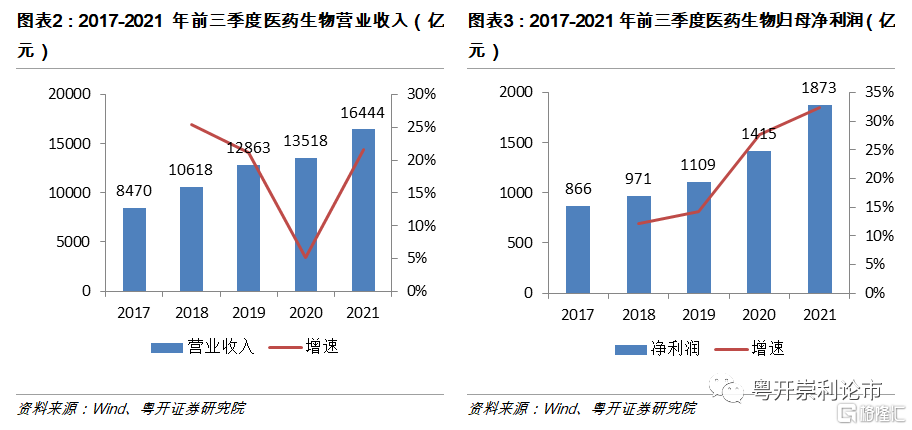 2021年醫藥生物板塊營業收入和淨利潤規模創歷史新高,淨利潤同比增長32.36%。截至2021年三季度,醫藥生物板塊實現營業收入16444億元,同比增長21.64%。實現歸屬母公司股東的淨利潤總額1873億元,同比增長32.36%。從營業收入和淨利潤的角度思考,2021年前三季度醫藥生物板塊保持了較高的增速,其中板塊淨利潤增速創近五年新高。