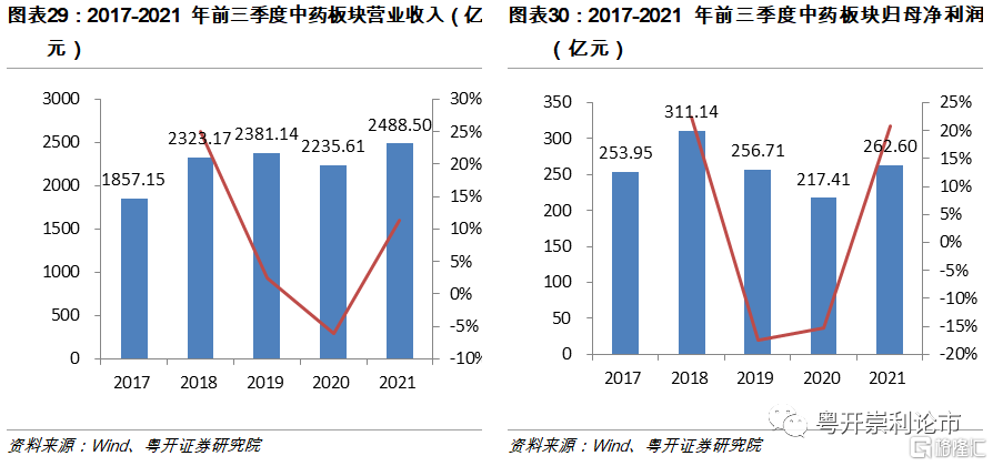 政策搭橋,2021年中藥板塊利潤大幅提升。截至2021年三季度,中藥板塊(共72家企業)實現營業收入2488.5億元,同比增長11.31%;實現歸母淨利潤262.6億元,同比增長20.79%。2021年中藥板塊淨利潤增速大幅提升,一方面源於2020年中藥板塊受疫情影響,業績承壓;另一方面,近年來,國家對於中醫藥振興發展的支持力度不斷提升,2021年政府工作報告強調實施中醫藥振興發展工程。而5月出臺的《關於支持國家中醫藥服務出口基地高質量發展若幹措施的通知》更如一針強心劑,推動中醫藥服務貿易,助力中醫藥服務國際化,中醫藥迎來歷史性發展契機。