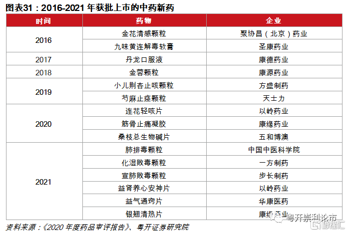 中醫藥創新大潮奔涌,新藥上市數量達近五年新高。據統計,2016年至2021年,共有15款中藥新藥獲批上市,其中2020年共三款新藥上市,分別是以嶺藥業的連花輕咳片、康緣藥業的筋骨止痛凝膠、五和博澳的桑枝總生物鹼片。2021年,共6款中藥新藥獲批上市,數量達近五年新高,分別是中國中醫科學院的肺排毒顆粒、一方製藥的化溼敗毒顆粒、步長製藥的宣肺敗毒顆粒、以嶺藥業的益腎養心安神片、華康醫藥的益氣通竅片和康緣藥業的銀翹清熱片。