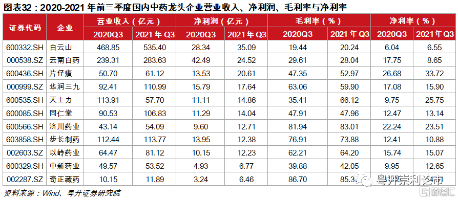 截至2021年三季度,共9家中藥企業淨利潤突破10億元,其中白雲山(35.09億元)、雲南白藥(24.52億元)和片仔癀(20.61億元)處於行業前列。大多數企業的盈利能力持續改善,包括以嶺藥業、片仔癀、同仁堂等。未來,隨着政策的大力扶持和中藥創新進程的提速,品牌中藥價值有望凸顯。疊加部分中藥的強消費屬性,需求端有望持續打開。對此,我們重點推薦兩條邏輯主線:(1)創新引領的中藥企業;(2)具有強消費屬性,需求端有望持續打開的中藥企業,建議關注片仔癀、同仁堂、康緣藥業、濟川藥業等。