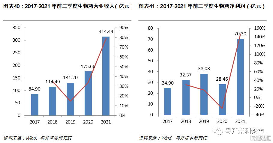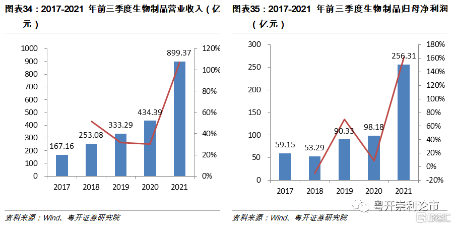 2021年生物製品板塊表現亮眼,板塊增速超100%。截至2021年三季度,生物製品板塊(共46家企業)實現營業收入899.37億元,同比增長107.04%;實現歸母淨利潤256.31億元,同比增長161.06%。生物製品板塊業績的大幅提升主要源於疫苗板塊和生物藥板塊的爆發,前者淨利潤同比增長299.19%,後者淨利潤同比增長147.05%。