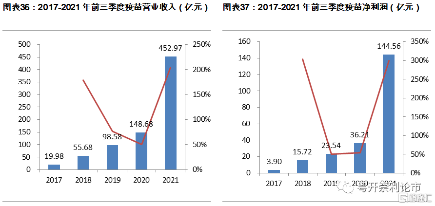 疫苗板塊業績爆發,淨利潤同比提升299.19%。截至2021年三季度,疫苗板塊實現營業收入452.97億元,同比增長204.66%;實現歸母淨利潤144.56億元,同比增長299.19%。2021年疫苗板塊業績的爆發一方面源於新冠疫苗需求的放量,截至11月16日,31個省和新疆生產建設兵團累計報告接種新冠病毒疫苗24億劑次;另一方面,疫情加強了民衆對疫苗的認知,隨着疫情的緩和,HPV疫苗、肺炎疫苗的接種逐步恢復。