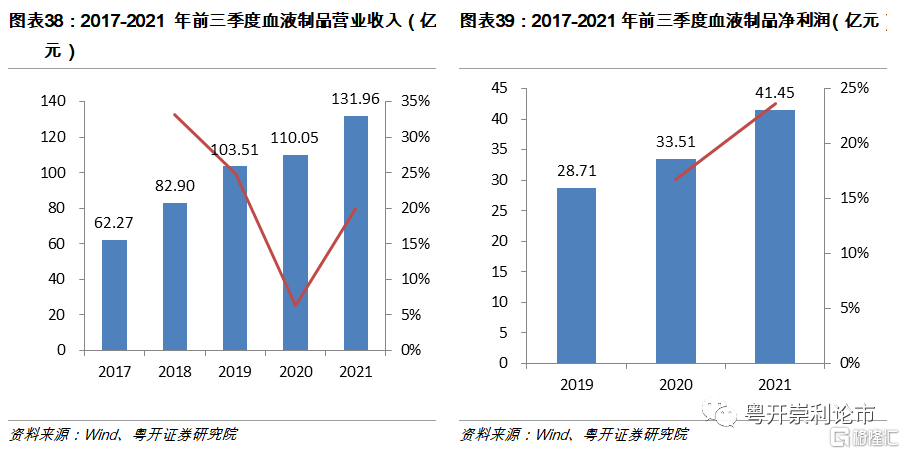 血製品板塊擺脫疫情掣肘,業績拐點可期。截至2021年Q3,血液製品板塊實現營業收入131.96億元,同比增長19.9%;實現淨利潤41.45億元,同比增長23.68%。血液製品的放量一方面源於疫情期間採漿量下降, 2021年供給逐步恢復;另一方面,隨着醫院診療業務的恢復,血製品醫院銷售額環比回升。